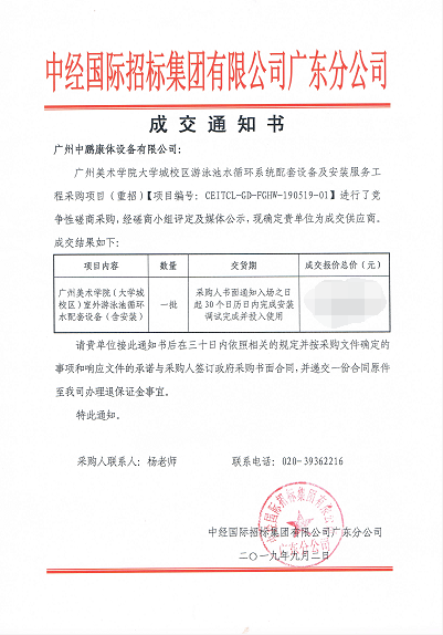 2019年9月2日,在這天從中經(jīng)國際招標集團有限公司獲悉,經(jīng)過激烈競標,我司以絕對的優(yōu)勢中得廣州美術(shù)學院大學城校區(qū)游泳池水循環(huán)系統(tǒng)配套設(shè)備及安裝服務(wù)工程。