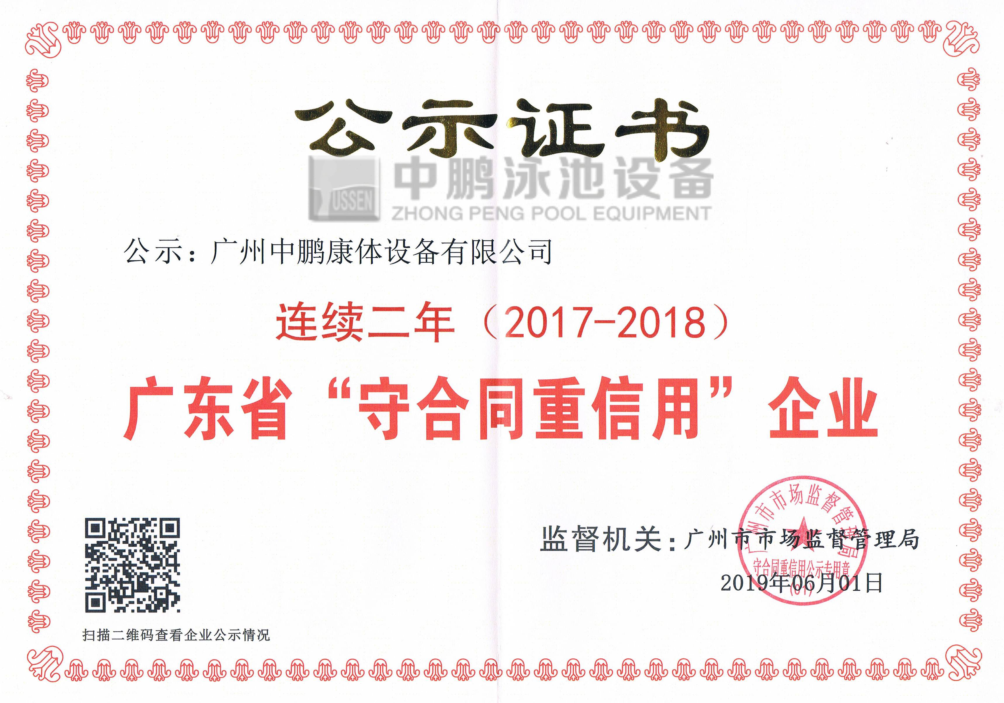 廣州中鵬康體設(shè)備有限公司連續(xù)2年榮獲廣州市工商行政管理局頒發(fā)的“廣東省守合同重信用企業(yè)”榮譽(yù)證書和牌匾, 上述連獲榮譽(yù)稱號的取得,意味著公司在行業(yè)信用方面取得了政府權(quán)威機(jī)構(gòu)的認(rèn)可,是對公司信用度的肯定,是公司實(shí)力的表現(xiàn)。以上榮譽(yù)的取得也有助于拓展公司業(yè)務(wù),提高公司業(yè)務(wù)承攬能力,為公司業(yè)績的增長提供支持。同時(shí),擴(kuò)大了公司休閑康體領(lǐng)域的影響,對公司提高綜合競爭并實(shí)現(xiàn)長遠(yuǎn)發(fā)展目標(biāo)具有重要戰(zhàn)略意義。